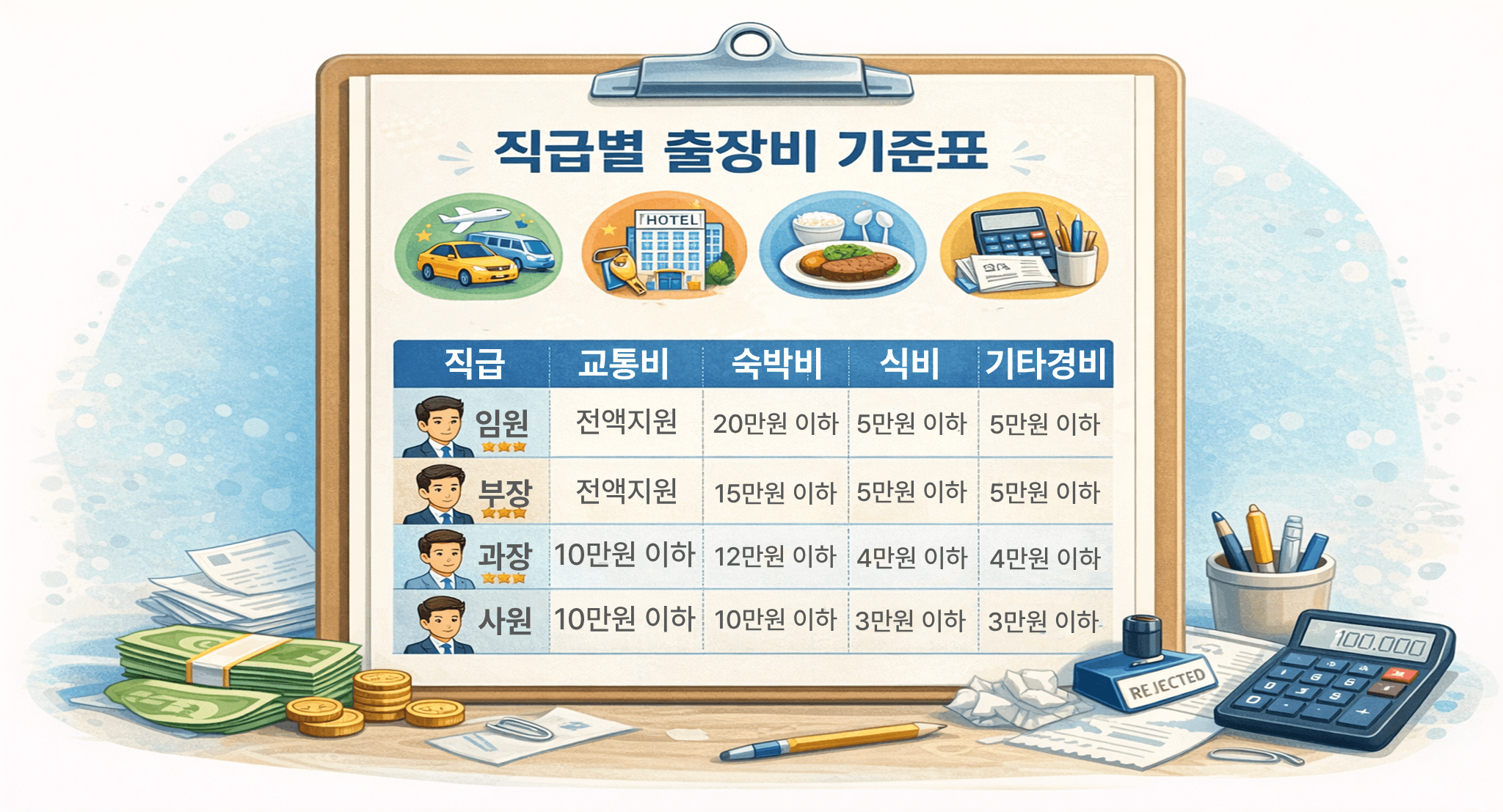 같은 직급인데 출장 비용이 다르면 문제가 생깁니다. 어떤 과장은 호텔에 18만 원, 다른 과장은 12만 원. "왜 나만 적게 쓰라고 하나요?" 불만이 나옵니다. 기준이 없으니 설명할 근거도 없습니다.