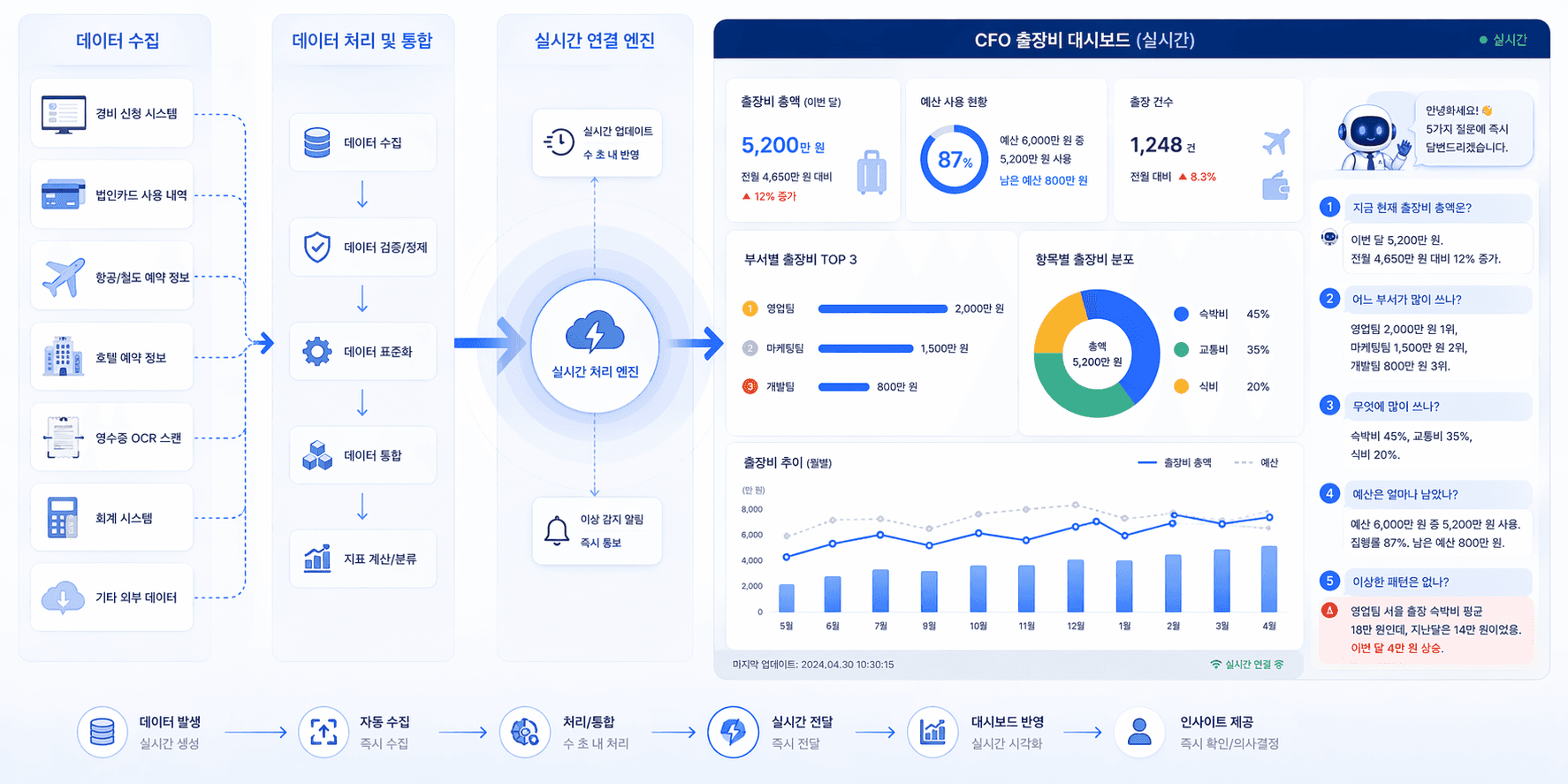 CFO: "지난달 출장비 얼마?" → 재무팀: 각 부서에 문의 → 취합 작업 → 엑셀 작성 → 보고 (반나절~하루)