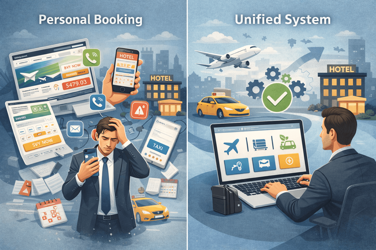각 직원이 온라인 여행사에서 제각각 예약하다 보니 가격도 다르고 규정 준수 여부도 확인할 수 없습니다. 총무팀이 일일이 확인해서 "이거 규정 초과인데요?" "예산은 확인했어요?" 물어봐야 하는 상황이 반복됩니다.