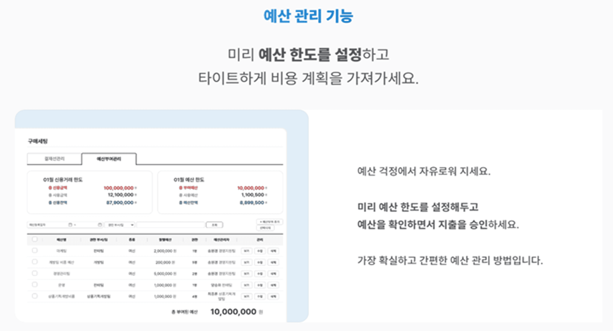 법인카드 사용에 기준이 없어서 누가 어디서 무엇을 사도 됩니다. 예산 확인도 안 되고, 월말에 재무팀이 확인할 때 "이 부서 예산 초과예요"라고 발견해도 이미 사용한 후라서 늦었습니다.