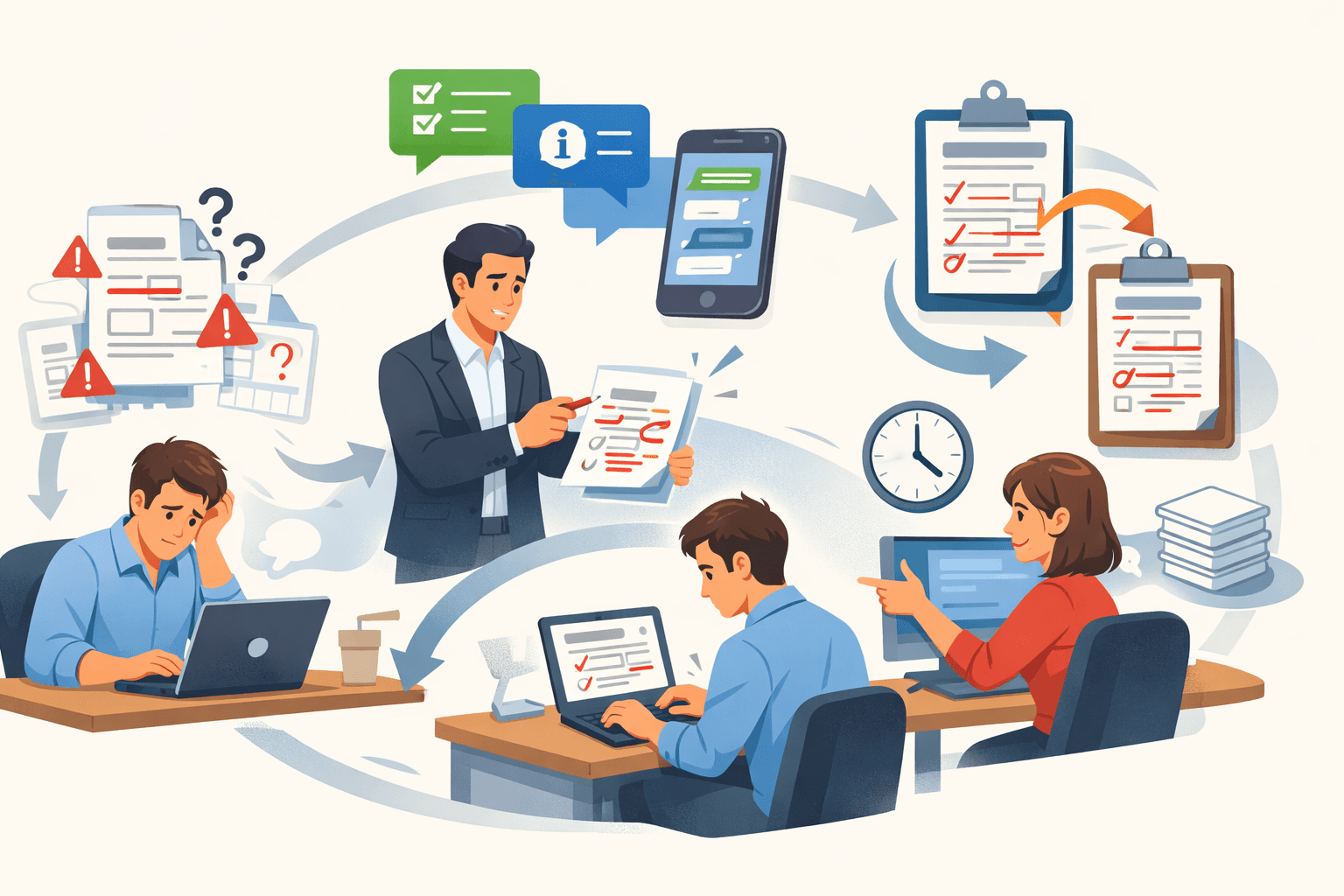 월요일 오전, 총무팀 이 대리에게 메신저가 옵니다. "출장 품의서 어떻게 써야 하나요?" 영업팀 신입사원의 질문입니다. 양식을 보내주고 설명합니다. "출장 목적, 일정, 예상 비용 적어서 보내주세요." 30분 후, 품의서가 도착합니다. 출장 목적란에 "거래처 방문", 예상 비용 란에 "50만 원 정도". 구체적인 내용이 없습니다. "어느 거래처인가요?" "숙박비, 교통비 따로 적어주세요." 다시 요청합니다. 수정본이 오고, 또 빠진 정보를 물어보고, 세 번째 수정본이 와서야 승인을 올립니다. 하나의 품의서 처리에 2시간이 걸렸습니다. 매일 반복됩니다. 제대로 작성된 품의서라면 10분이면 끝날 일입니다.
