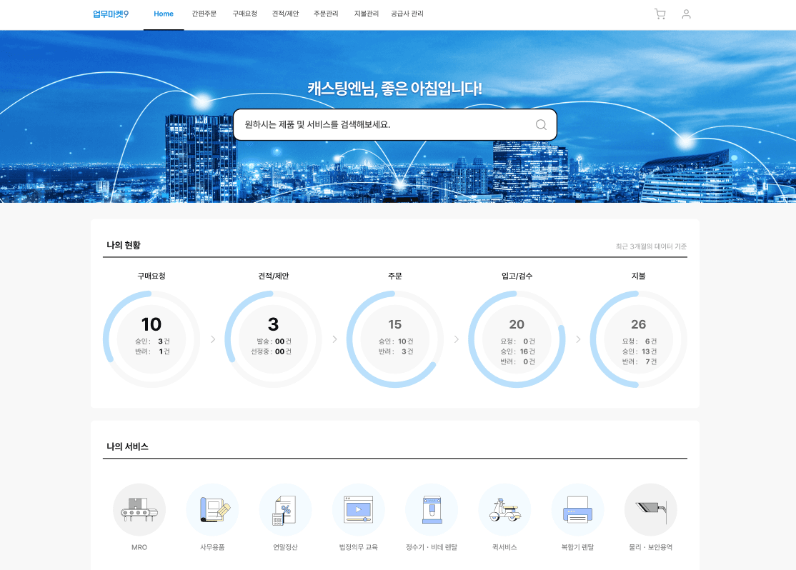 업무마켓9은 B2B 마켓플레이스와 관리 시스템이 통합되어 있습니다. 7,800여 개 파트너사가 연결되어 있어 사무용품, IT장비, 청소용품, 간식, 시설관리 서비스까지 플랫폼 안에서 직접 구매할 수 있습니다. 주문과 동시에 자동으로 기록되고, 예산이 차감되며, 배송이 추적됩니다. 총무 담당자는 여러 사이트를 돌아다니며 개별 주문하는 대신 하나의 플랫폼에서 모든 것을 처리합니다.